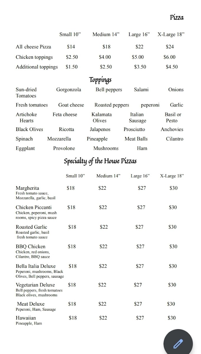 Nestled in Modesto, CA, Bella Italia invites you to savor authentic Italian cuisine in a charming, Tuscany-inspired setting. The menu is a delightful testament to time-honored traditions, offering an array of enticing dishes that celebrate the rich flavors of Italy.